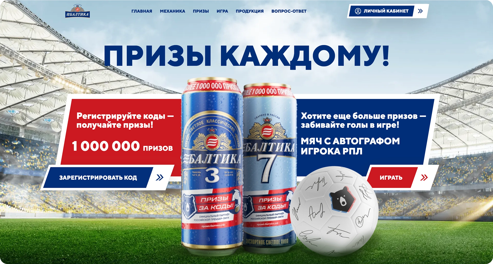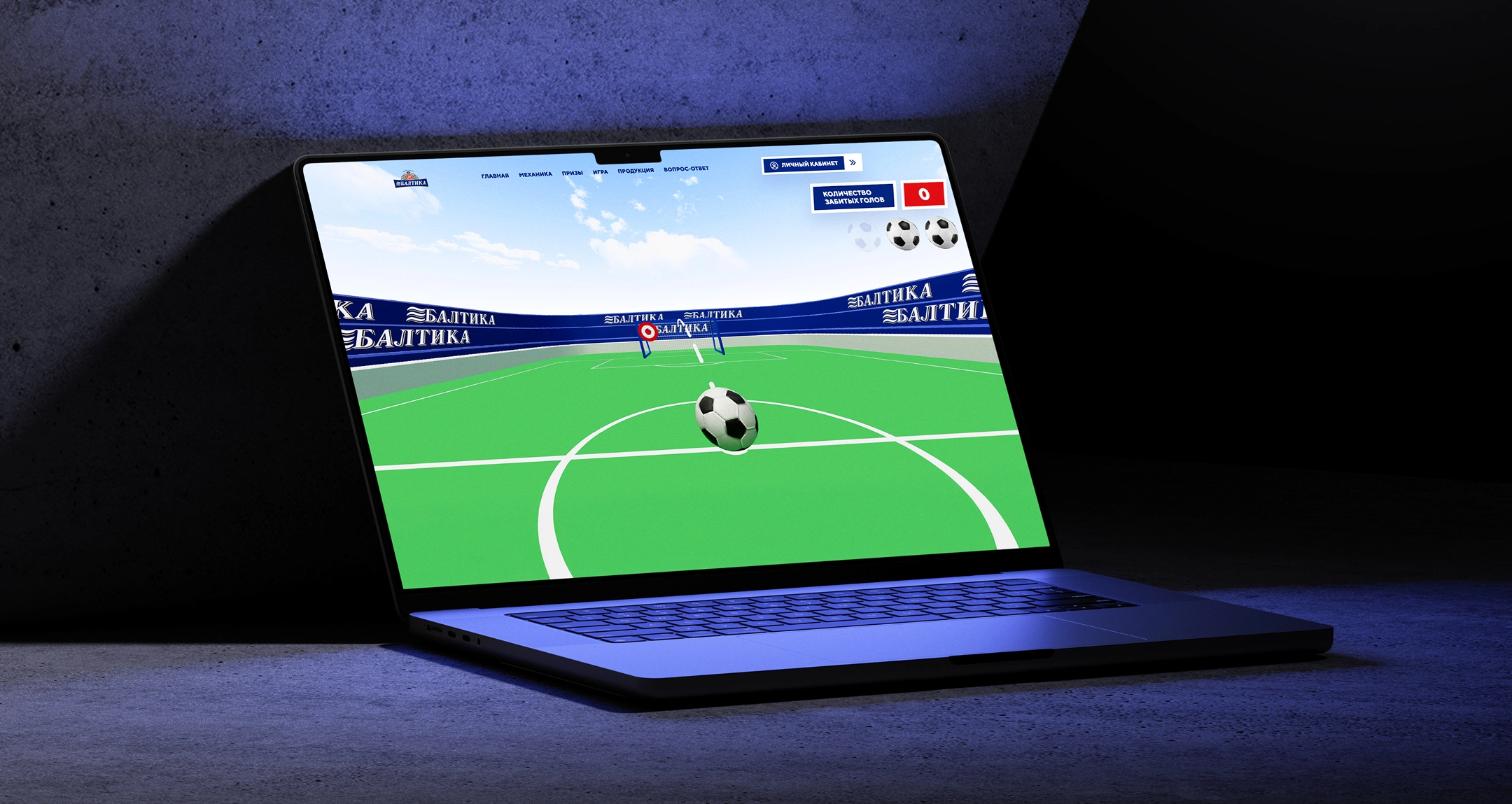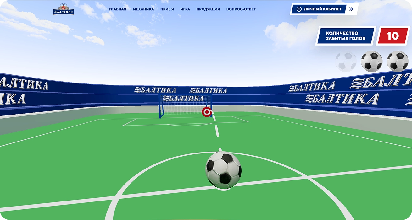 Разработали интерактивную игру для лендинга. Пользователь видел призыв:«Сыграйте в игру, забейте больше всех голов и получите мяч с автографами игроков!». После нажатия на кнопку он попадал на виртуальный стадион «Балтики», где управлял ударом футболиста, рисуя пальцем траекторию мяча. С каждым уровнем задача усложнялась — менялись позиция, расстояние, уменьшалась зона ворот и появлялись препятствия.